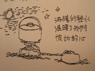 維維及我,依著我們的節奏前進,看到了一輛轎車閃著停車燈,是陳先生及他們家的小男孩。陳先生說,在登山的時後,先到的會熱一些咖啡或飲料,等著後到的人,給他們享用,這感覺很好,他想和他的小男孩一起參與我們,在這裡煮一些飲料給我們喝。我們2對父子在月亮星空下,各喝了熱呼呼的熱可可,一起拍照,在心中帶著一種溫暖的感覺,各自在黑夜中走向不同的路程。