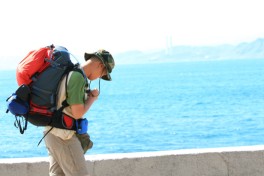 決定搭公車到金山,在金山背著背包找飯館,已經沒什麼力氣、感到想吐。剛點的菜飯送上,維吃的有味,我才吃兩口就想整個吐出來。覺得好累,當維維吃飯時,我睡了。醒來,維已用畢,留了一份。此刻,開始有胃口了,今天大概中暑了吧。